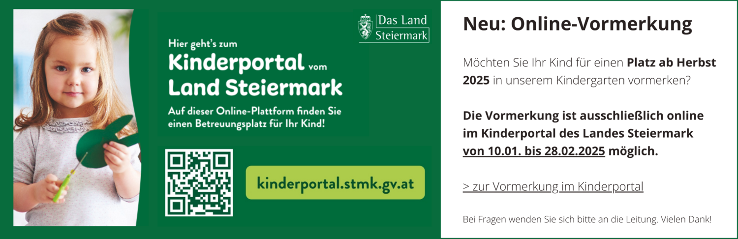 Wir freuen uns schon sehr darauf, Sie und Ihr Kind kennenzulernen! Die Vormerkung ist vom 10.1. bis zum 28.2.2025 ausschließlich online über das Kinderportal des Landes Steiermark möglich. Das persönliche Aufnahmegespräch findet in der Kalenderwoche 8 (24.2-28.2.) statt.