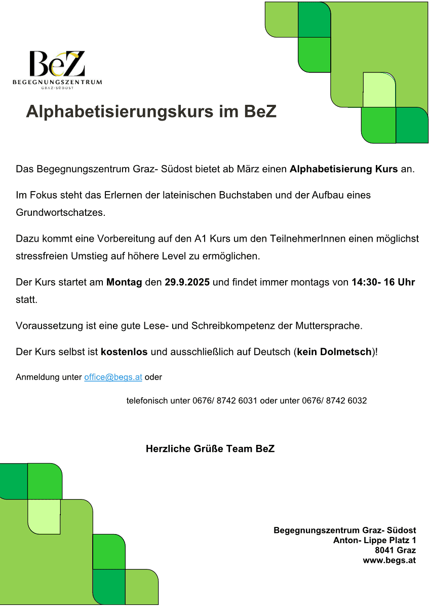 Anmeldung: Dagmar Nöst, 0676 8742 6031 oder office@begs.at