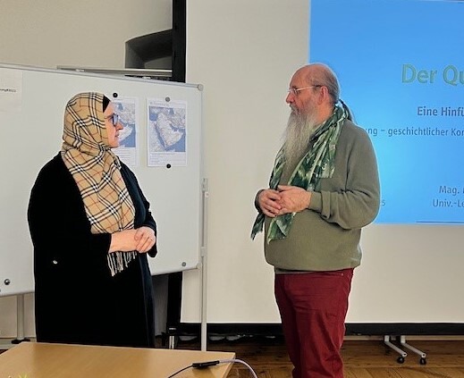 Die beiden Referierenden, PPH Augustinum-Professorin Mevlida Mešanović und Peter Anna Zeillinger von der Universität Wien, tauchten mit den Kursteilnehmenden in den historischen Kontext der Entstehung der Botschaft des Qur'ans ein. Im Mittelpunkt standen dabei die Verbindungslinien zwischen Bibel und Qur'an, die jüdischen und christlichen Spuren in der islamischen Offenbarung sowie die theologischen und gesellschaftlichen Rahmenbedingungen zur Zeit der Entstehung des Qur'ans. Die Teilnehmenden widmeten sich dem altarabischen und spätantiken Kontext und diskutierten die mekkanische wie auch die medinensische Phase der Botschaft des Qur'ans.