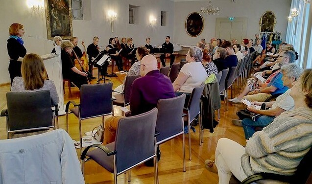 Umrahmt und thematisch gestützt wurde die Lesung durch das St.-Thomas-Consort des Johann-Joseph-Fux-Konservatoriums (Fachbereichs ,Alte Musik‘, Leitung: Claire Pottinger-Schmidt), das Auszüge aus seinem Konzertprogramm ,Da pacem‘ zum Besten gab: Mit Barock- und Renaissanceklängen von Thomas Crécquilon, Cristoforo Caresana sowie Rognoni Taeggio vermittelte das elfköpfige Ensemble die menschliche Trauer um das Verlassensein vom Glück in Kriegszeiten sowie die zeitunabhängig Botschaft vom notwendigen Frieden.