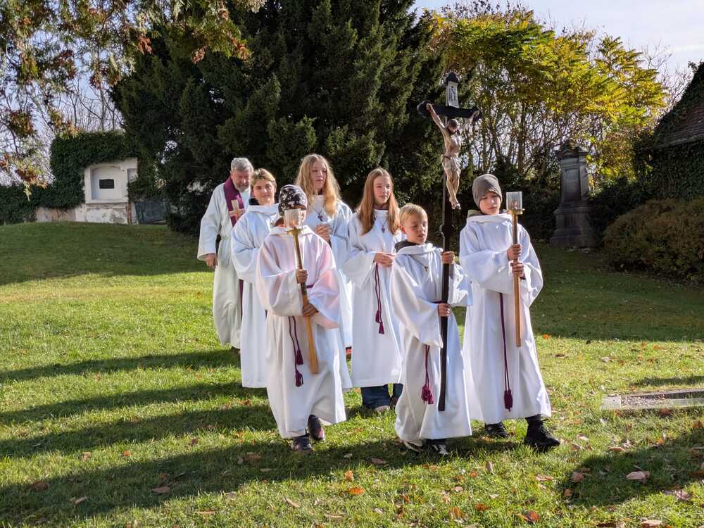 Anschließend begleiteten die Ministranten den Priester bei strahlendem Sonnenschein am Friedhof in Peggau bei der Gräbersegnung, zu der viele Angehörige gekommen waren.