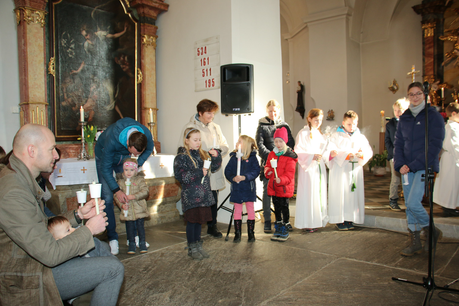 Drei Mütter sprachen bei der Predigt über die Themen aus dem Evangelium (Salz und Licht) und der Taufe. Bei der Taufe stehen drei Symbole im Mittelpunkt: Das Taufwasser, das weiße Kleid und die Taufkerze. Diese Taufkerze brachten die Kinder mit, um sie an der Osterkerze zu entzünden und so an ihre Taufe erinnert zu werden.
