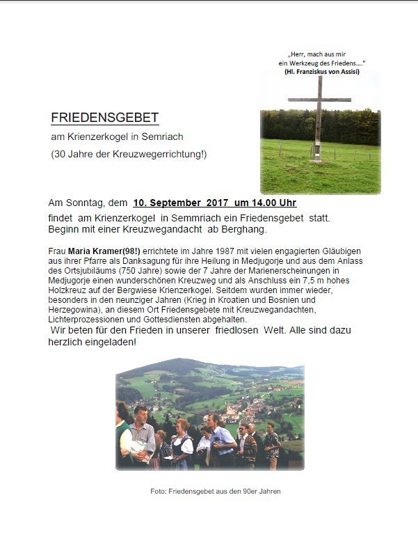 Frau Maria Kramer(98!) errichtete im Jahre 1987 mit vielen engagierten Gläubigen aus ihrer Pfarre als Danksagung für ihre Heilung in Medjugorje und aus dem Anlass des Ortsjubiläums (750 Jahre) sowie der 7 Jahre der Marienerscheinungen in Medjugorje einen wunderschönen Kreuzweg und als Anschluss ein 7,5 m hohes Holzkreuz auf der Bergwiese Krienzerkogel. Seitdem wurden immer wieder, besonders in den neunziger Jahren (Krieg in Kroatien und Bosnien und Herzegowina), an diesem Ort Friedensgebete mit Kreuzwegandachten, Lichterprozessionen und Gottesdiensten abgehalten.