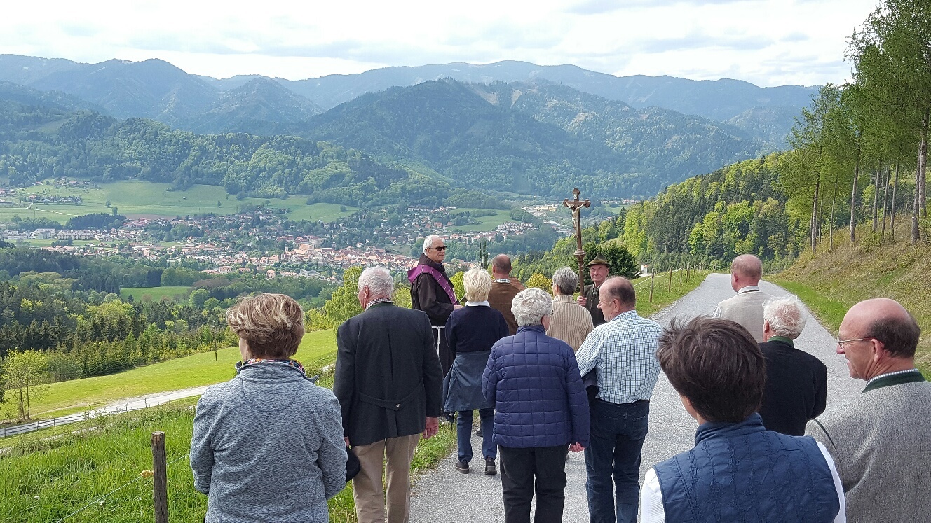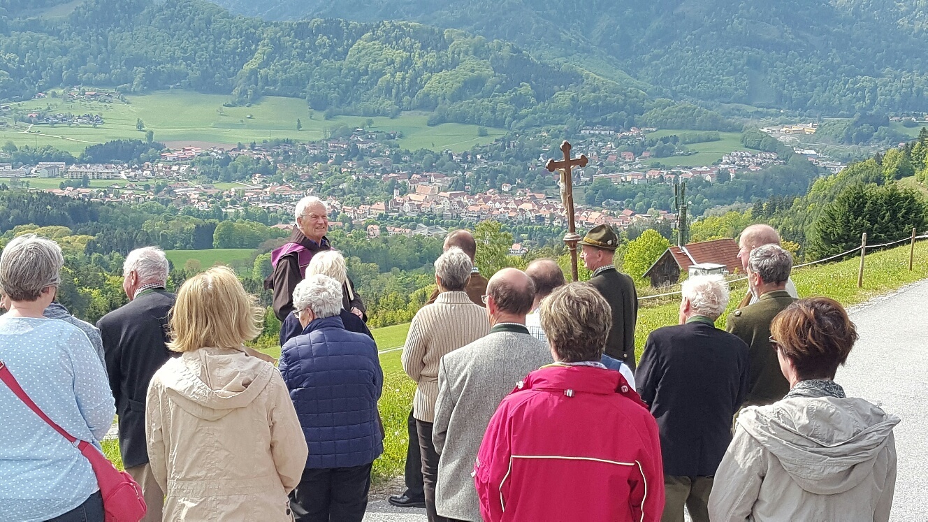 Bei schönem Wetter und toller Aussicht auf Frohnleiten wanderten zahlreiche Personen mit. Pater Simon gestaltete diese Feldersegnung mit Unterstützung der Dirnbergbauern.