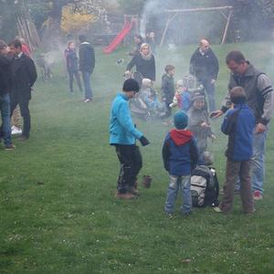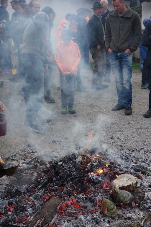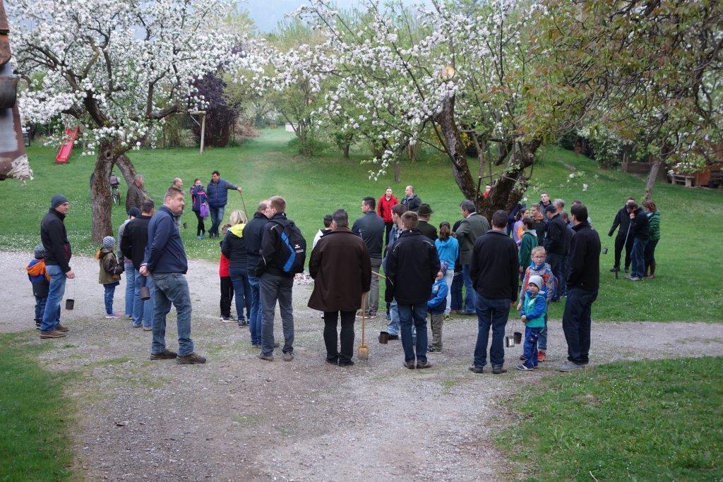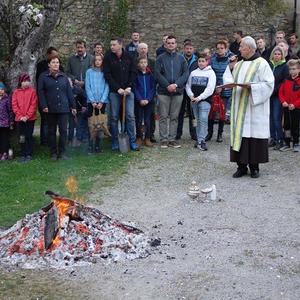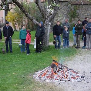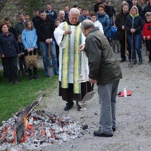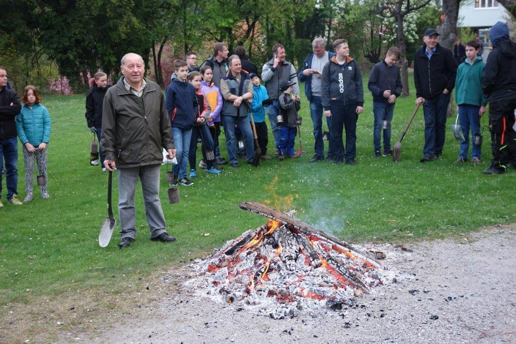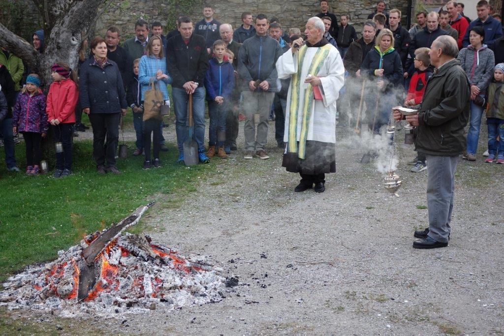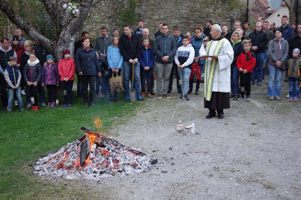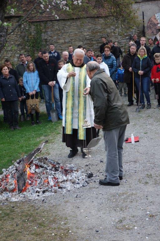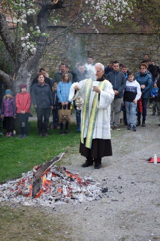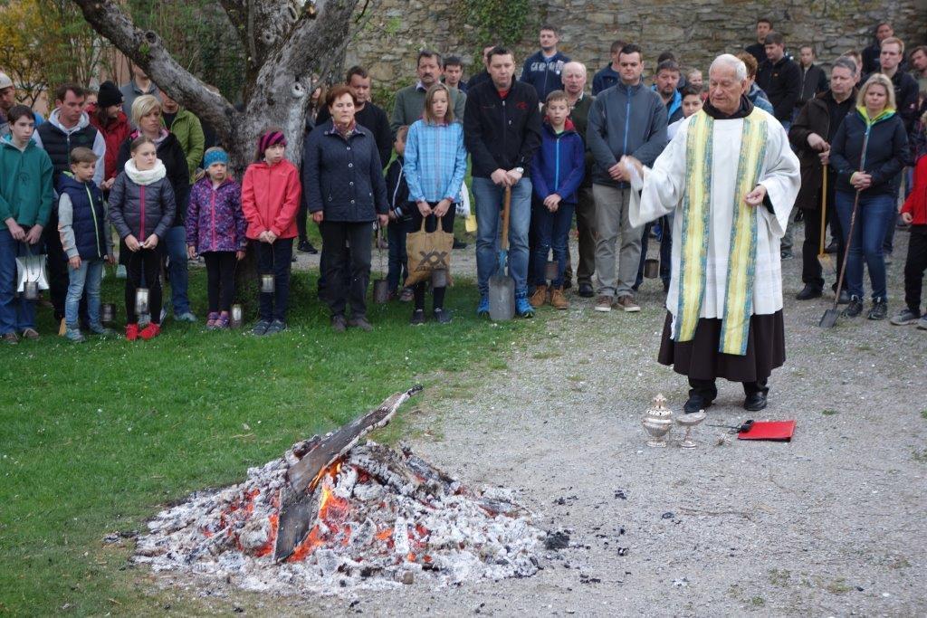 Am Karsamstag um 7 Uhr früh kamen viele Kinder, teilweise mit ihren Eltern oder Großeltern, aber auch viele Erwachsene in den Klostergarten, um an der Feuerweihe teilzunehmen. Das Feuer wurde von Hans Rappold vulgo Rebinger schon frühmorgens entfacht. Diese lobenswerte Tätigkeit führt er schon über 40 Jahre aus. Das Feuer wurde dann von Pater Simon ohne Unterstützung von Ministranten gesegnet.