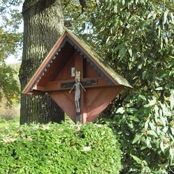 Das Wegkreuz ist auf einem stabilen Betonsockel befestigt. Davor ist ein kugelförmiger Eibe-Wacholder-Strauch gepflanzt, der von Bediensteten des Forstgartens gepflegt wird. Seitlich steht noch ein wolliger Schneeball, ein kräftiger, sommergrüner und weißblühender Strauch.