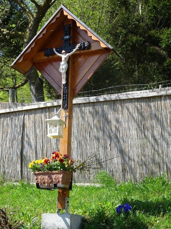 Unter dem Kruzifix sind eine weiße Laterne und ein Blumenkisterl angebracht. Ein Betonfundament sorgt für einen sicheren Standort. Sohn Patrik Neuherz, ein gelernter Spengler, stattete dieses Wegkreuz kunstvoll mit einem Kupferdach aus. Zwischen den gepflanzten Sträuchern ist auch ein Zugang möglich.