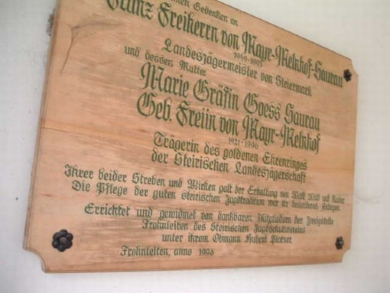 Die ehrwürdige Kapelle im Bereich der Forstdirektion Mayr-Melnhof Frohnleiten wurde im Jahre 1998 von den dankbaren Mitgliedern der Zweigstelle Frohnleiten des Steirischen Jagdschutzvereins (JSV) unter dessen Obmann Ing. Hubert Platzer errichtet. Gewidmet wurde sie dem frommen Gedenken an Franz Freiherrn von Mayr-Melnhof-Saurau (1949-1993) und dessen Mutter Marie Gräfin Goess-Saurau (1921-1996), Trägerin des goldenen Ehrenringes der Steirischen Landesjägerschaft. Ihrer beider Streben und Wirken galt der Erhaltung von Wald, Wild und Natur. Die Pflege der guten steirischen Jagdtradition war ihnen ein ganz besonderes Anliegen. Daran erinnert heute eine seitlich im Innenraum angebrachte und wunderschön gestaltete Gedenktafel.
