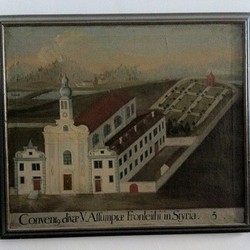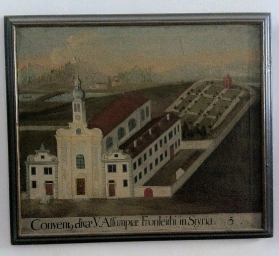 Eines der älteren Bilder unseres Klostergartens ist ein Gemälde im Servitenkloster zu Innsbruck, das die Filiale „Conventum divae V. Assumptae Fronleithi in Styria“, unser Kloster zeigt. Unser Wirtschaftsratsobmann Franz Koiner hat uns Fotos davon gemacht. Leider ist das Bild nicht datiert, das Vorhandensein des Dachreiters schränkt es aber zwischen 1683 (Fertigstellung des Turmes) und 1763 (Brand, nach dem er nicht mehr aufgebaut wurde) ein. Im Hintergrund sieht man die Gartenanlage, wie sie- leicht idealisiert- einem Barockgarten entspricht. Geometrisch angelegte Wege, das Lusthaus im Hintergrund und interessanterweise ein Obstgarten dort, wo jetzt alljährlich das Erntedankfest stattfindet. Wenn man in letzterem Bereich im Boden gräbt, findet man Unmengen von Ziegelschutt, der sicher sekundär dort abgelagert wurde, möglicherweise nach den verheerenden Bränden, die Frohnleiten mehrmals heimgesucht hatten. Ein paar Dinge fallen noch auf: Die Mauer, die den ganzen Garten umgab, später jedoch (siehe Franziszeischer Kataster 1820-1825) nur mehr den Gemüsegarten und das Glashaus in seiner jetzigen Form einschloss. Weiters ist kein Brunnen eingezeichnet, was recht ungewöhnlich ist für eine Zeit, in der Wasserleitungen zur Versorgung noch nicht existierten.