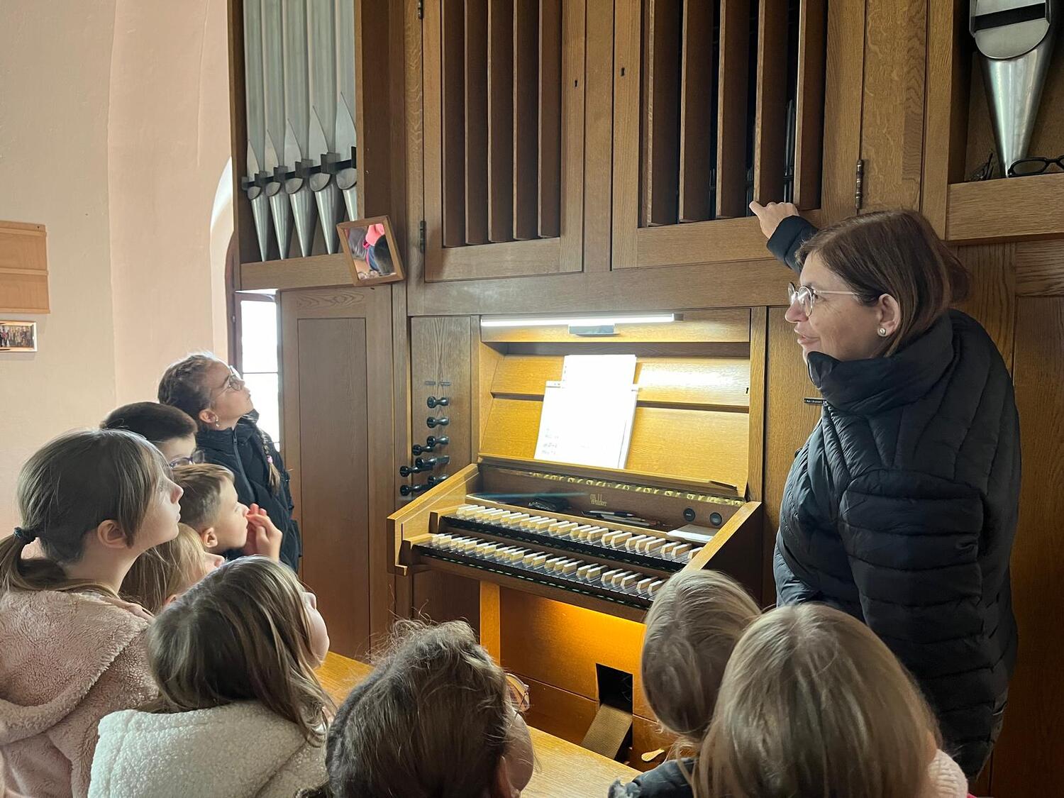 So durften die Kinder bewusst den Klängen der Orgel lauschen und selbst ausprobieren, wie es sich anfühlt, auf dem Instrument zu spielen. Was in der Sonntagsmesse ansonsten von den Kindern nur hörbar ist, durfte direkt am Chorraum der Kirche entdeckt werden. Danke für diese Erfahrung und vielleicht wird ja dadurch die Neugierde geweckt, dieses Instrument spielen zu lernen.