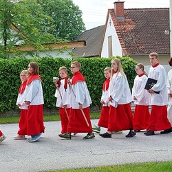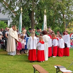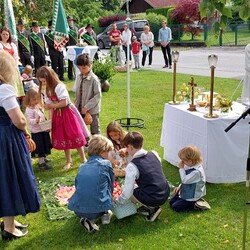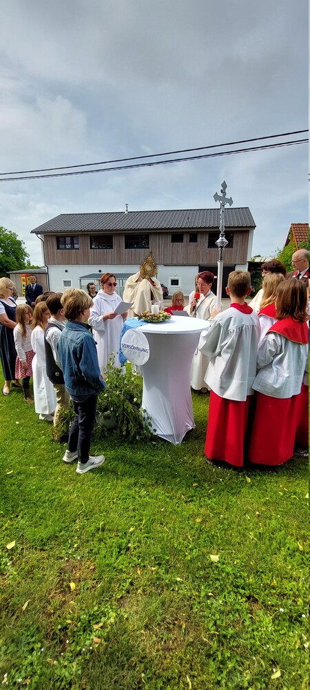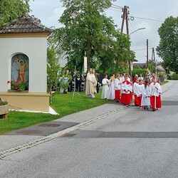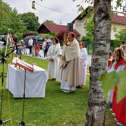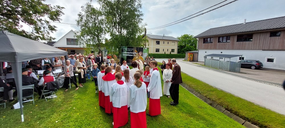 Im Anschluss an die Hl. Messe, zelebriert von Vikar Gerhard Hatzmann und begleitet von Kantorin, Lektoren und liturgischen Diensten beider Pfarren, fand eine Andacht bei den vier Stationen am Dorfplatz statt. Für die kleine Prozession waren vier Brottische als Altäre gerichtet, als Sinnbild für die vier Himmelsrichtungen und dafür, dass Christus der Heiland der ganzen Welt ist. Im gemeinsamen Liedruf "Brot des Lebens" zogen die liturgischen Dienste und die Kinder stellvertretend für das Volk Gottes zu den vier Altären: Brot der Liebe – Brot der Versöhnung – Brot des Friedens – Brot der Hoffnung. Zum Abschluss erteilte Vikar Hatzmann den Eucharistischen Segen, verbunden mit der Einladung, das Allerheiligste gemeinsam zur Kirche zu begleiten. Die Feier schloss mit dem gemeinsam gesungenen "Te Deum" ab. Zu den Feierlichkeiten waren auch die Vereine wie Feuerwehr und ÖKB eingeladen.
