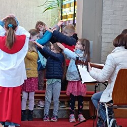 Eine Bläsergruppe der Marktmusik umrahmte die Segnung musikalisch. Danach folgten viele der Einladung zur Prozession. Die Kinder gingen mit dem großen Palmbuschen und stellten in der Kirche den Einzug, sowie die kindgerechte Passion mit einfachen Mitteln dar. Ein Ministrant trug stellvertretend für Jesus ein kleines Stück lang das schwere Kreuz, das am Ende mit einem schwarzen Tuch verhüllt wurde.