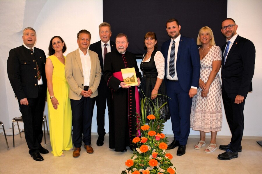 „Durch Gottes Gnade bin ich, was ich bin“ – dieser Primizspruch begleitet Monsignore Dr. Erich Linhardt auf seinem priesterlichen Weg. Er wurde noch von Papst Franziskus zum Kaplan Seiner Heiligkeit ernannt. Beim Festakt würdigte Pfarrer Claudiu Budău diesen Ehrentitel als Zeichen weltkirchlicher Wertschätzung und als Dank für ein Leben voller Loyalität, Weitblick, Herzblut und tiefem Glauben. Auch Bürgermeister Hubert Holzapfel dankte Monsignore Linhardt für seinen Einsatz in den Gemeinden, mit denen er trotz seiner Leitungsaufgaben in der Diözese weiterhin eng verbunden ist. Die Haltung, für andere da zu sein, habe er von seinem Vater gelernt, sagte Linhardt in seiner persönlichen Replik. Wenn dies in seinem Leben sichtbar werde, empfinde er große Dankbarkeit. Musikalisch wurde der Festakt vom Vokalensemble unter der Leitung von Siegfried Kager umrahmt (Bass: Alexander Reisl, Alt: Klaudia Reisl, Sopran: Elisabeth Kager-Huber, Tenor: Siegfried Kager).