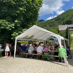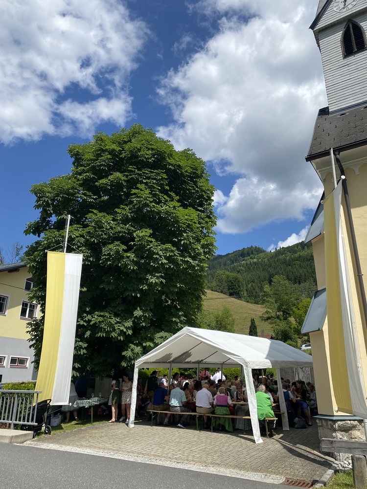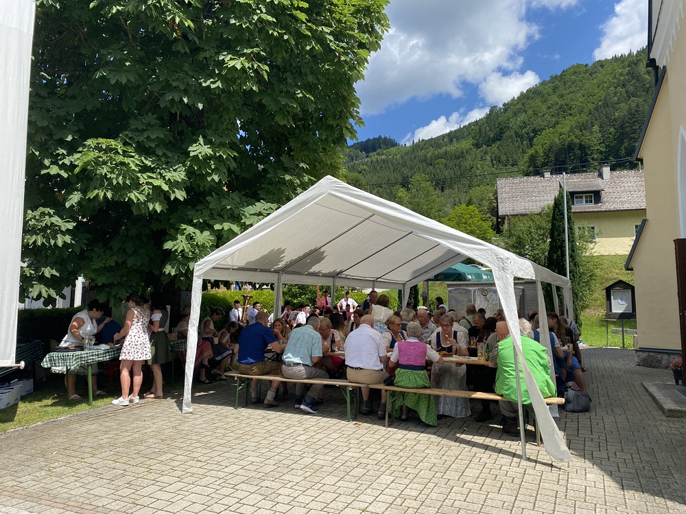 Pater Thomas feierte mit uns das Hochamt um 10:30 Uhr. Geige, Orgel und Trompeten brachten uns in feierliche Stimmung. Nach dem Gottesdienst spielte die Bergknappenkapelle Unterlaussa. Es gab alles von Schnitzel bis Schilcher Charmant.