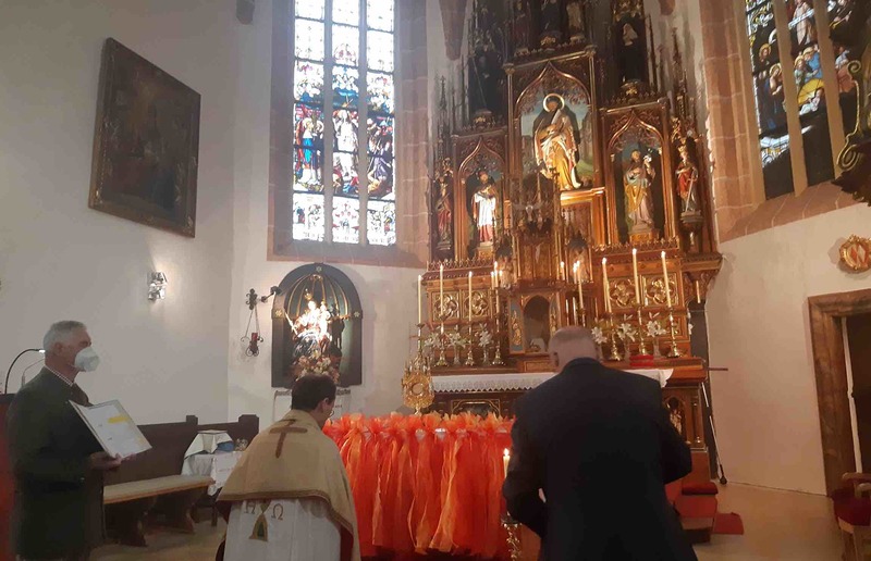 Die Fronleichnamsprozession konnte situationsbedingt auch heuer nicht in gewohnter Form stattfinden. Zum traditionellen „Zuwa (Uma) beten“ zu Christi Himmelfahrt und Fronleichnam versammelten sich trotzdem einige Gläubige um zur Pfarrkirche zu beten. Angeführt werden sie durch den Kreuzträger, die wie immer liebevoll geschmückte Kreuze mittragen durften. Danke an dieser Stelle für die Bereitschaft der Dekoration und an alle Beter für die Aufrechterhaltung der Tradition. Der Festgottesdienst wurde in gewohnter Form in der Pfarrkirche gefeiert. Im Anschluss wurde die Prozession in der Pfarrkirche bei den beiden Seitenaltären, dem Volksaltar und dem Hochaltar abgehalten. Der Gottesdienst und die Prozession wurden musikalisch durch Fritz Buder und Karin Fries gestaltet- ein herzliches Dankeschön dafür. Mit dem Wettersegen wurden wir am Ende gesegnet und erbitten damit gutes Wetter und eine gute Ernte für den bereits angebrochenen Sommer.